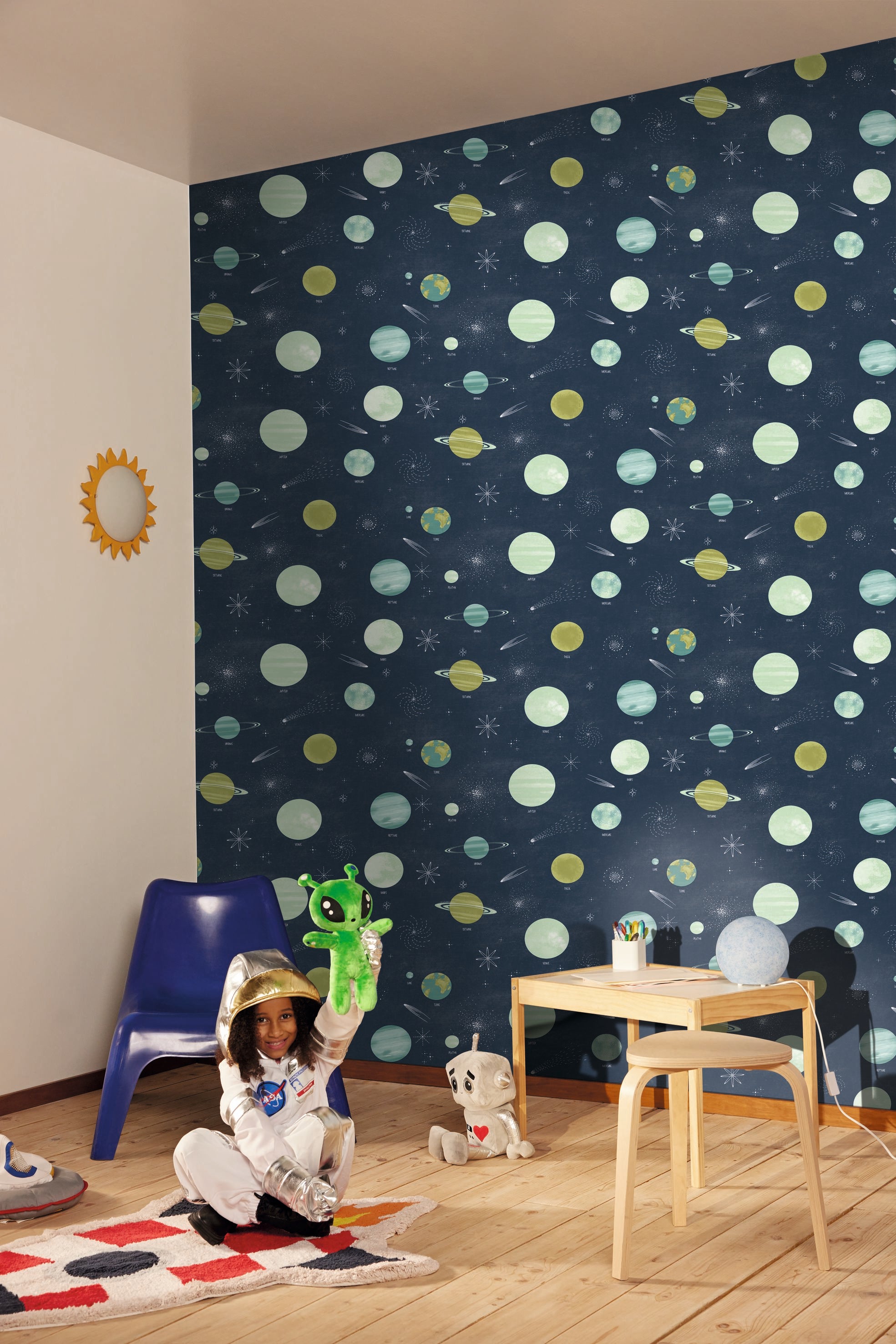 Which of their favourite worlds will be brought to life on their walls: the mysterious world of the forest or the creative world of manga? The jungle where tigers go "roar" or the one where dinosaurs go "grrr"? The world of the deep, where whales sing, or the world of the skies, with its head in the planets? The choice is yours... All we can confirm is that the designs for each world are available in panoramic versions and on non-woven wallpaper that's easy to hang in any room (bedroom, study, playroom...).